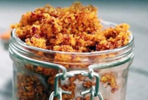 - जार का ढक्कन खोलकर इसमें तिल, साइट्रिक एसिड, नमक, चीनी, लाल मिर्च पाउडर और धनिया पाउडर एक बार ग्राइंडर और चला दें ताकि यह अच्छी तरह मिल जाए. (बटर गार्लिक फ्राइड राइस