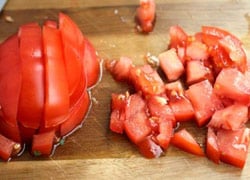 - टमाटर को चॉपिंग पैड पर रखकर सबसे पहले इसका निचला हिस्सा काट लें, अब इसे पलट कर छोटे-छोटे टुकड़ों में काट लें.