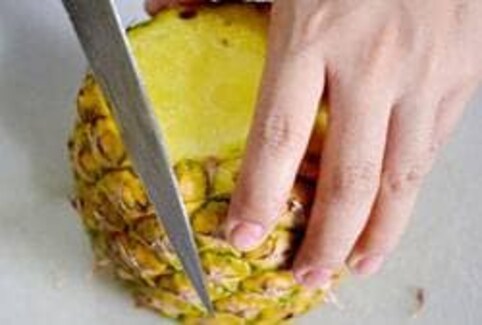 - पाइनएपल के ऊपर और नीचे के हिस्से को चाकू से काटें. एक-एक कर चारों तरफ के छिलके भी काटकर निकाल लें. अब इसके गूदे को मनचाहे आकार में काट लें.