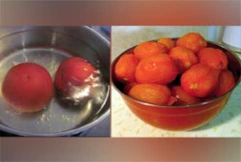 - सबसे पहले एक बर्तन में उबले पानी में टमाटरों को दो मिनट तक डालकर रख दें और फिर गरम पानी से निकालकर ठंडे पानी में डालें.