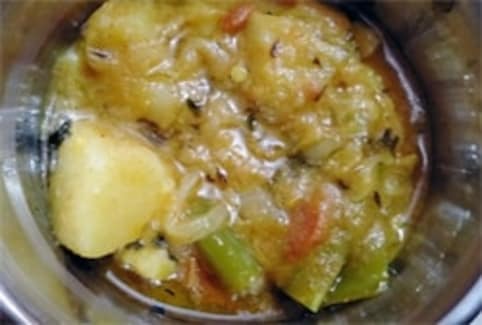 - अब इसमें शिमला मिर्च और आलू डालकर 5 मिनट तक भूनें.