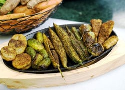- अब गैस पर एक कड़ाही में तेल गर्म करें. इसके बाद तेल में एक-एक करके फूलगोभी, गाजर, अरबी, आलू, मसाला भरी भिंडी, बैंगन और करेला फ्राई करके एक प्लेट में निकाल लें.