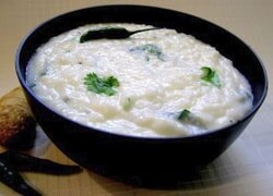 - अब छाछ, पानी, चावल-नारियल का पेस्ट और नमक डालकर कड़छी से चलाते हुए अच्छे से मिक्स कर लें.